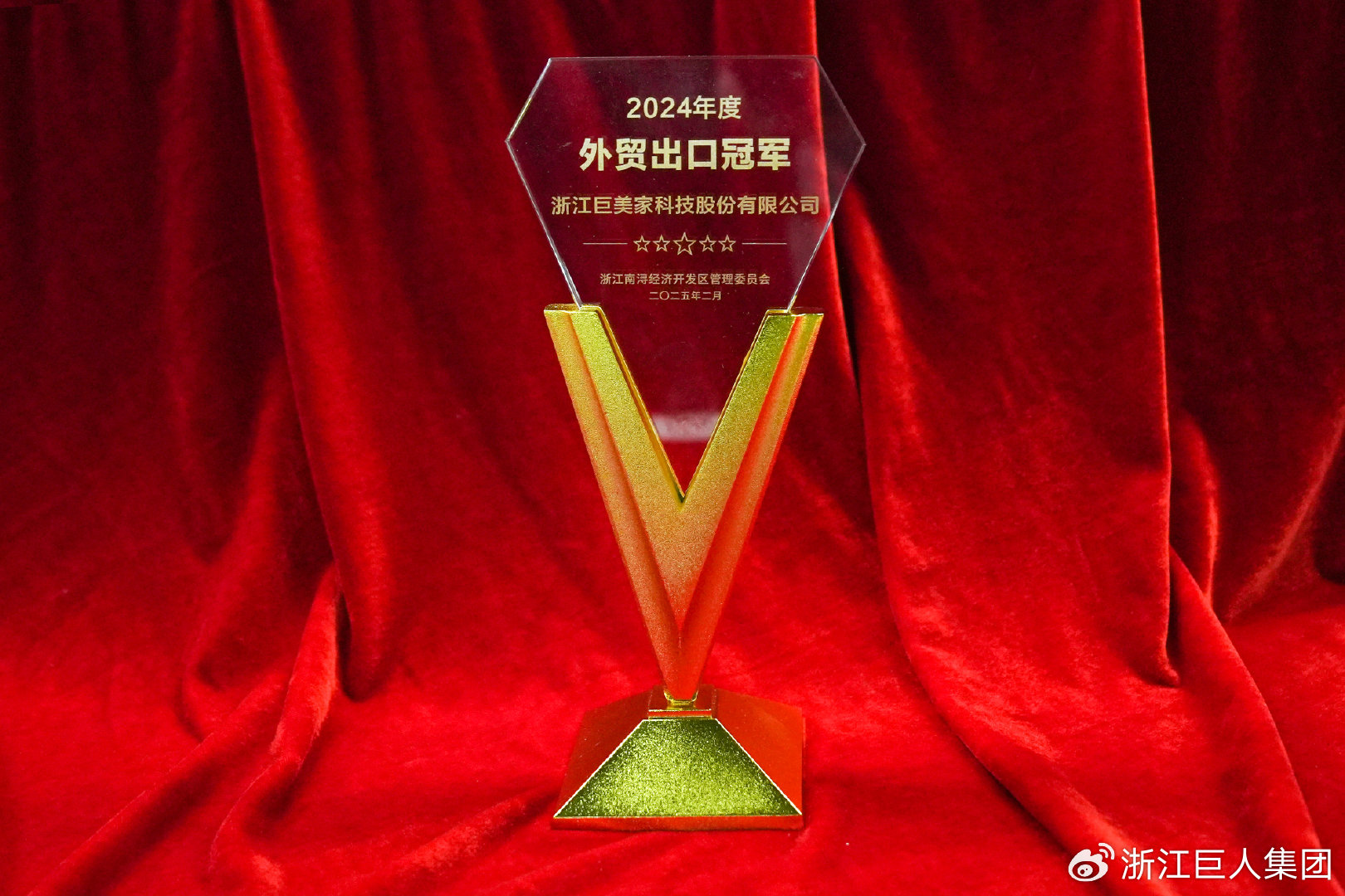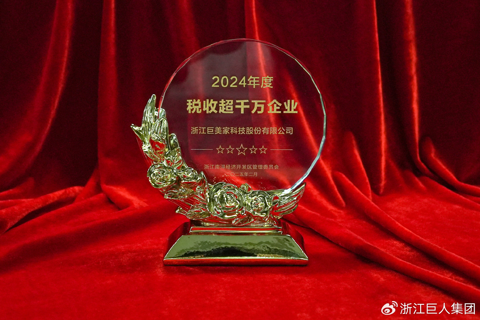大會表彰先進、選樹典型,激勵廣大企業在開發區“二次創業再出發、奮戰三年翻一番”的新征程中砥礪奮進。浙江巨人集團有限公司榮獲“2024年度科技領航企業”稱號,旗下浙江巨美家科技股份有限公司奪得“2024年度外貿出口冠軍”榮譽,并榮獲“2024年度稅收超千萬企業”稱號。